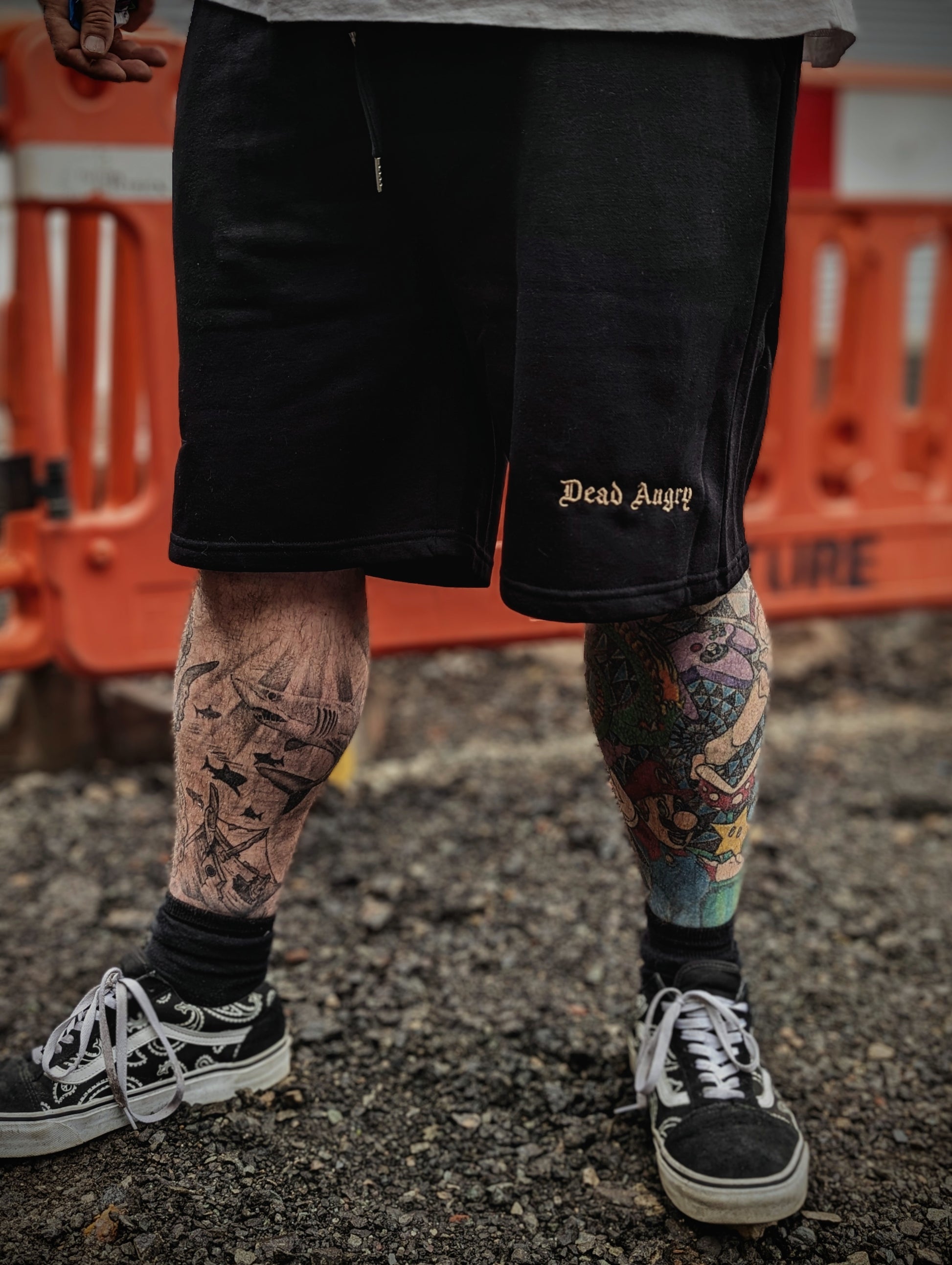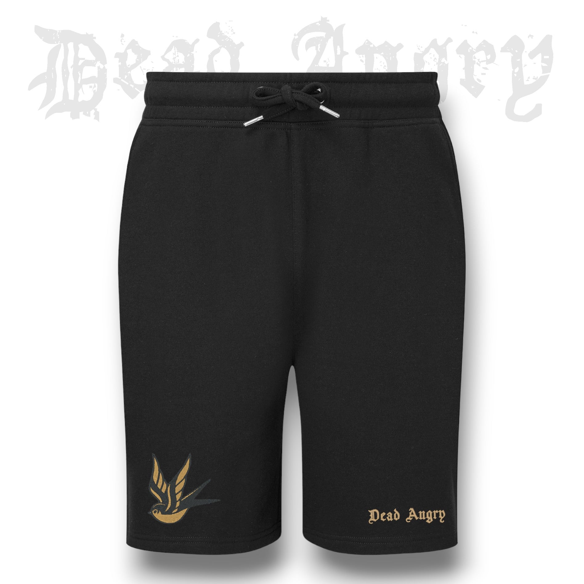 Black casual shorts with embroidered Swallow and Dead Angry logo