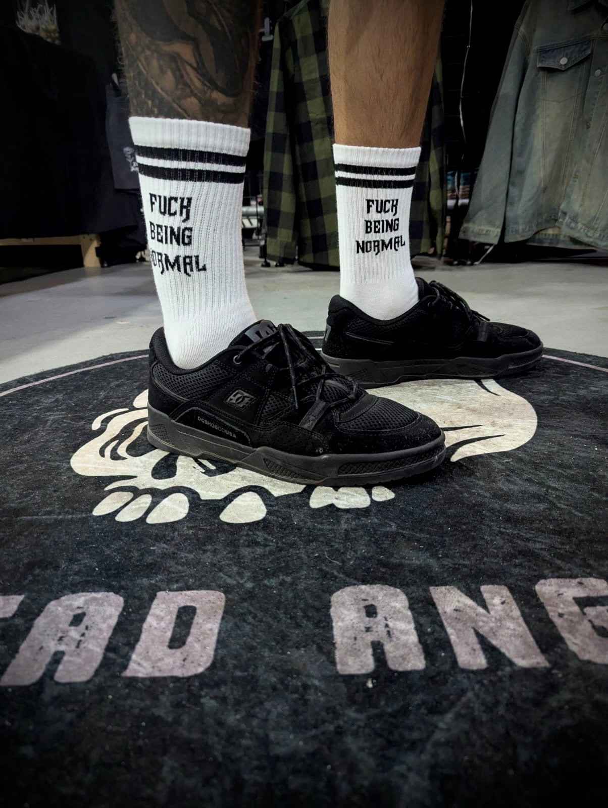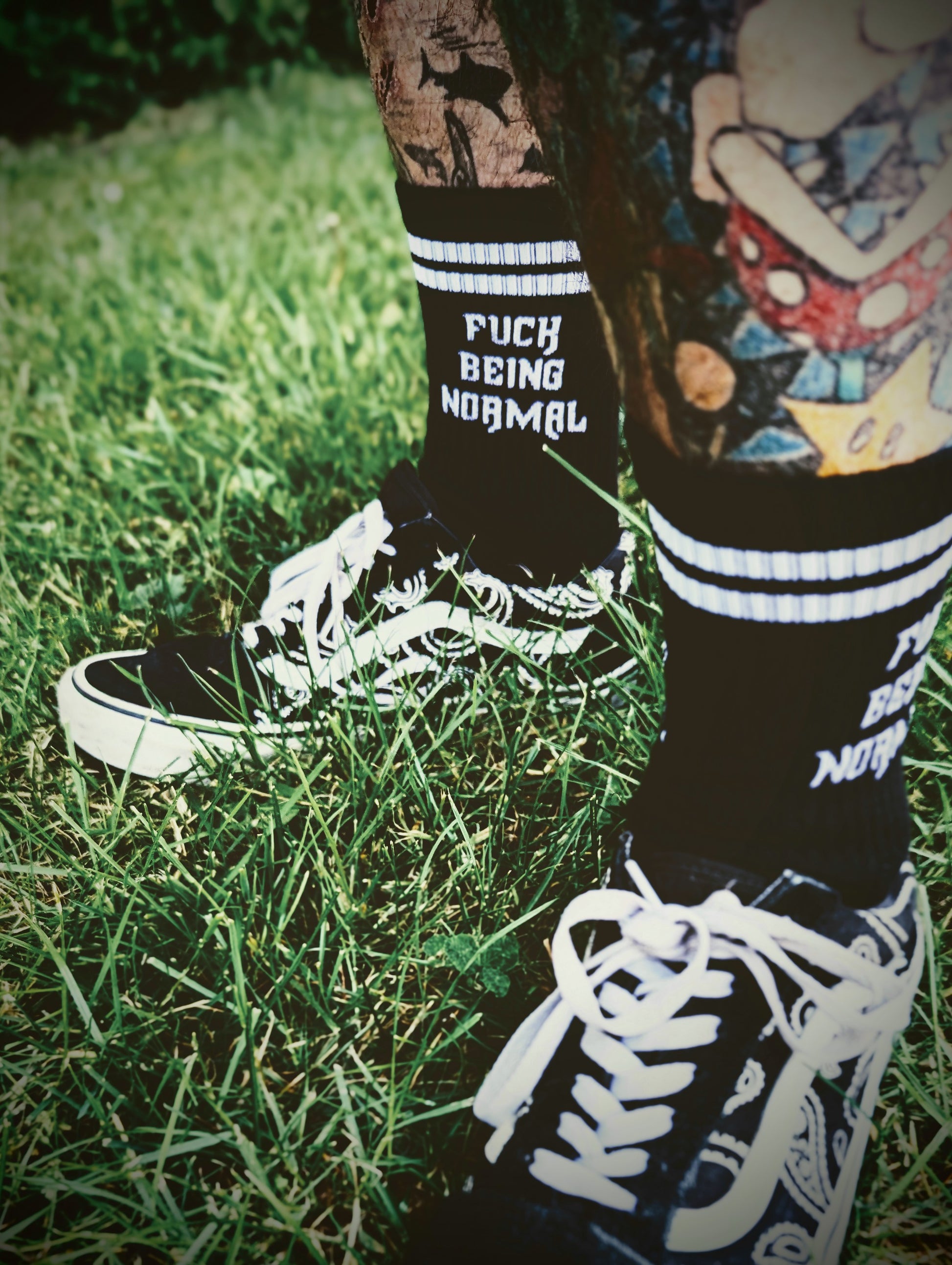 Featuring our signature Fuck Being Normal logo above the ankle on both sides, you can't go wrong with this white on black, old school classic look!