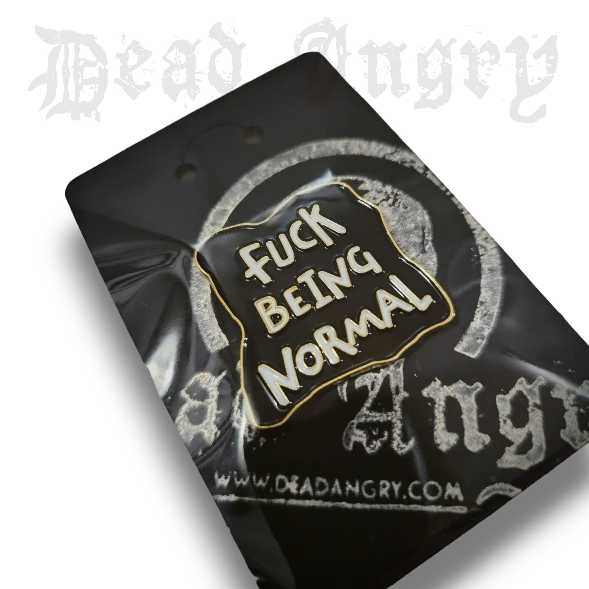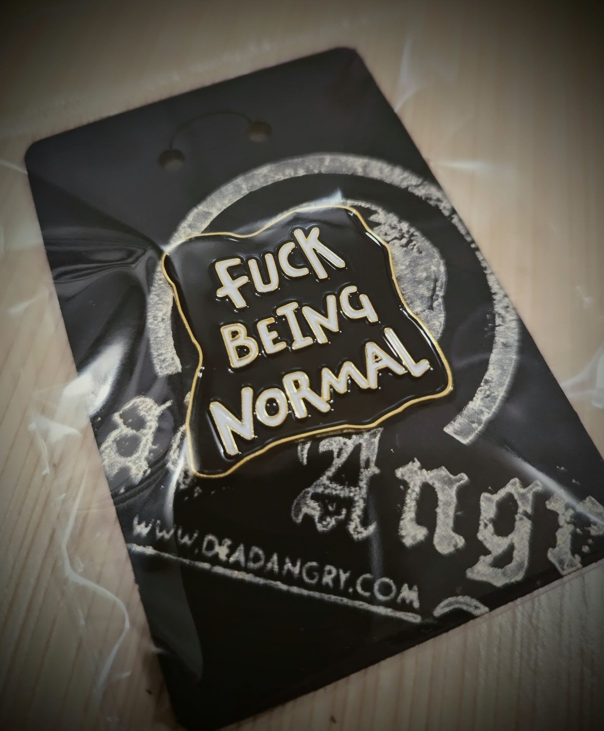 A chunky ceramic pin badge featuring the Dead Angry "Fuck Being Normal" slogan to spice up any outfit, or as a thoughtful gift for your weird friends!