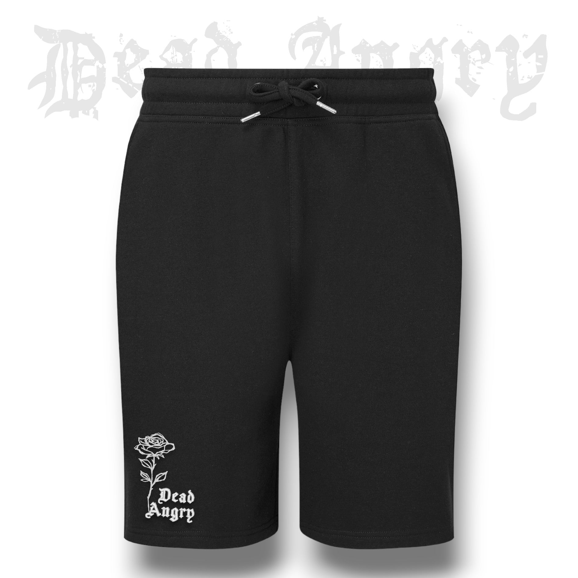 Relaxed fit, black casual shorts with embroidered sketch style rose and Dead Angry logo